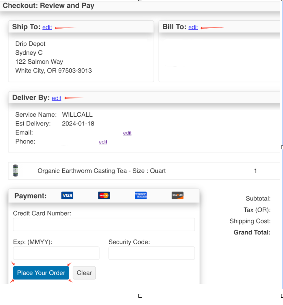 The following window will be the Checkout Review and Pay section. Here, you will verify the billing and shipping addresses, delivery method, and enter your credit card information. Any necessary corrections can be made in this window.