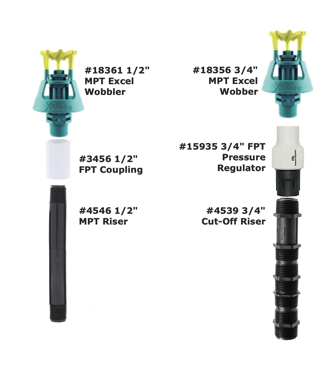 Mining wobblers are available with multiple inlet sizes of ½” or ¾” MPT. Below are two possible wobbler setup configurations. There are other possible configurations, even inverted configurations, but these are the most common. Note that one of these has included a pressure regulator directly on the riser itself so that each individual wobbler would have its own pressure regulator. This can be handy if you do not have an upstream pressure regulator or pressure reducing valve regulating pressure for the zone.