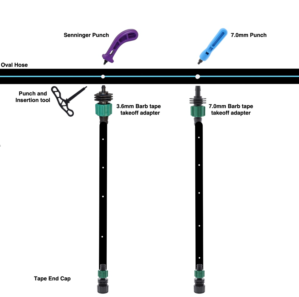 Item Links: (7.0mm Punch for 400 Bar), (Senninger Punch), (Irritec Perma-Loc Tape x Barb Tubing Takeoff Adapter), (Toro Blue Stripe Oval Hose), (Irritec Perma-Loc Tape End Cap), (Punch and Insertion Tool), and (Drip Tape)
