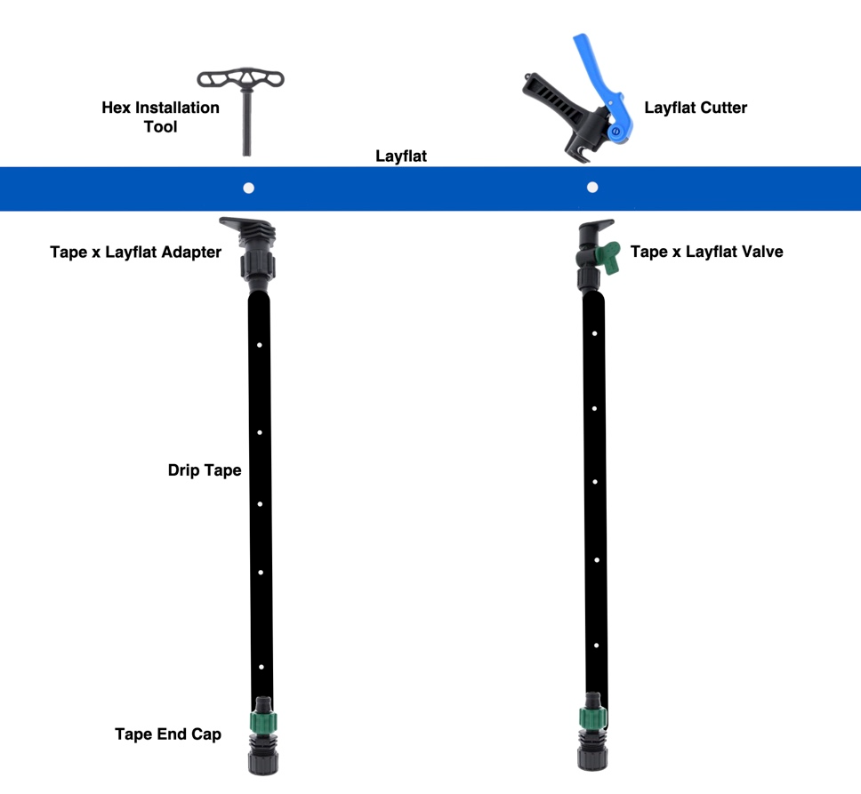 Item Links: (Flexi-Flat Layflat Hose by Irritec), (Layflat Cutter for Teardrop Fittings), (Layflat Fittings), (Irritec Tee Handle Hex Installation Tool), (Drip Tape), and (Irritec Perma-Loc Tape End Cap)