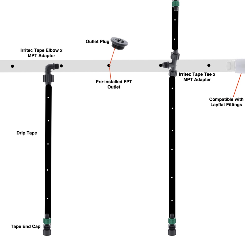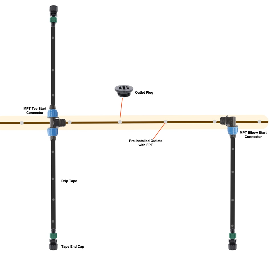 Item Links: (Netafim FlexNet Submain Pipe),(Netafim Outlet Plug for FlexNet), (Netafim FlexNet Tape Elbow Start Connector), (Netafim FlexNet Tee Start Connector), (Drip Tape), and (Irritec Perma-Loc Tape End Cap)