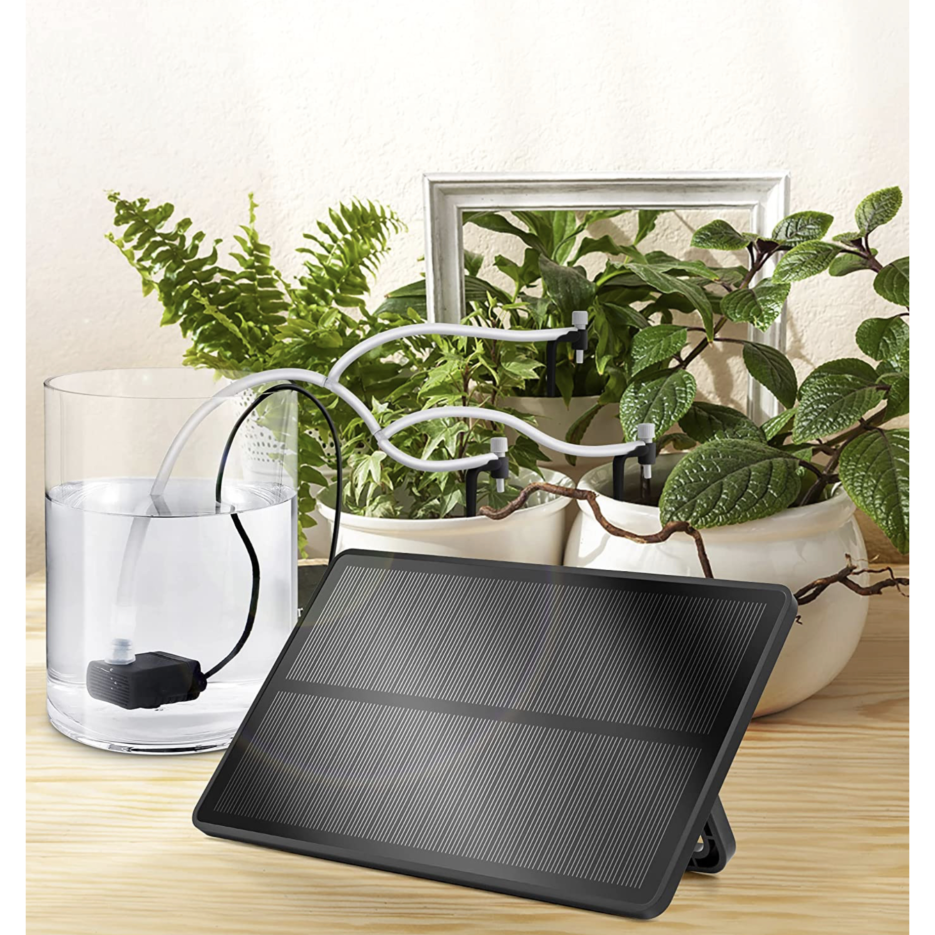 The Solar Drip Irrigation Automatic Self-Watering System is complete and ready to go; it comes with 16.5ft of silicone pipeline, water pump with a 9ft 10in cord, 6 drip emitters on tubing stakes, 6 T-barb fittings, 2 cross-barb fittings. No need to worry about where to place this system as the pump will do the hard work, so you'll just want to make sure it's placed in a well lit area that gets a decent amount of sunshine.